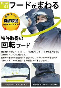 仕様 透湿・防水・防風・軽量・耐水圧(高水圧法)10,000mm・透湿性(B-1法)5,000g/m²,24hr・撥水・シームテープ・回転フード・取り外し可能フード・透明窓フード・ヘルメット対応フード・リュック対応・反射帯(反射テープ)・ベンチレーション(通気口)・総裏メッシュ・フラップ付きポケット・襟元ループリボン・二重袖仕様・ウエスト総ゴム+紐調節可能・裾元ボタンで2段階調節・収納袋付き・お名前タグ・学生用・通勤用・作業用 特許取得の回転フードで、雨の日でも視認性を確保 ヘルメットやリュックの上から着用できるゆったりタイプのレインウェアです。