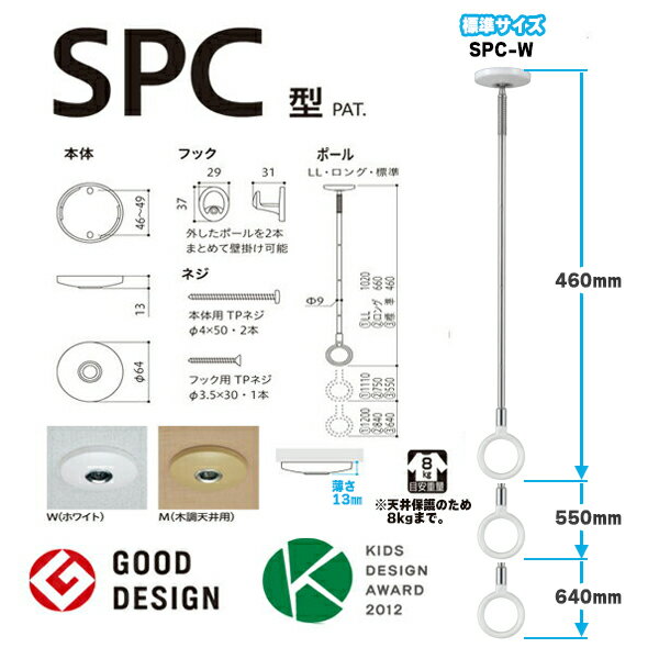 【仕様】ポール全長:460-550-640mm(3段階長さ調整)本体ベース:φ64【材質(表面仕上)】・本体:亜鉛ダイカスト(メッキ仕上)・カバー:亜鉛ダイカスト(塗装仕上)・ポール:ステンレス・ポール先端:亜鉛ダイカスト(メッキ仕上)・リング:ナイロン【付属部品】・本体取付けネジ(TPΦ4×50):4本 (木製野縁・軽天材に対応した取付パーツ)・カバー:2個・フック:2個・フック取付けネジ(TPΦ3.5×30):2本※コンクリート・傾斜天井等の取付けパーツは含めれておりません。