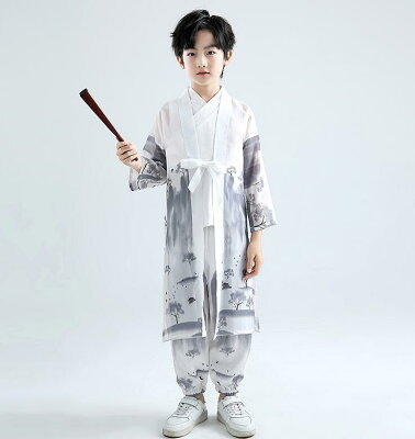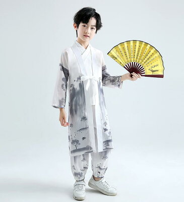 子供 中華服 チャイナ服3点セット キッズ 男の子 女の子 漢服 唐装 中華コスプレ衣装 華流 舞台衣装 ステージ衣装 長袖 ロング丈ブラウス サルエルパンツ インナー 山水 水墨 プリント チャイナ風 カンフー衣装 武術ウェア エスニック 中華民族ダンス衣装 白 赤 110~180cm