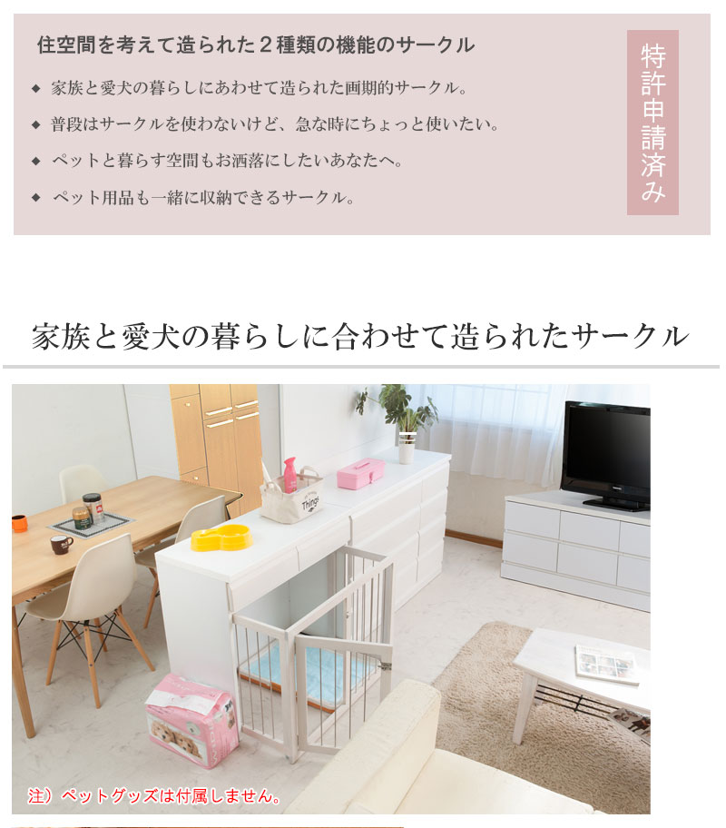 天然木を前板にあしらい、インテリア性も兼ね備え、収納も付いた便利なドッグサークルです。