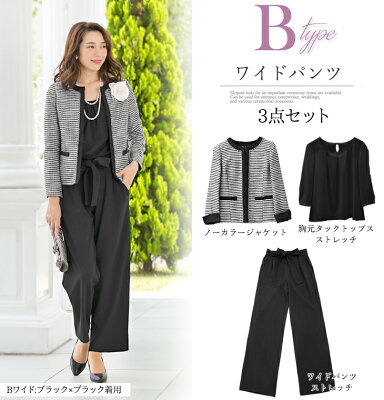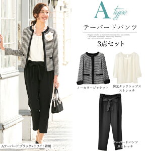 セレモニー対応パンツスーツの詳細 ジャケット ・配色デザイン ノーカラージャケット ・長袖タイプ ・ボーダー柄ツィード生地(ラメ入り) ・裏地付き トップス ・胸元タック入りプルオーバー ・七分袖タイプ ・無地 ・伸縮性のあるストレッチ素材 ・ご家庭で洗濯OK(洗えるウォッシャブル仕様) パンツ ・テーパードパンツまたはワイドパンツ ・リボンベルト付き ・ウエストゴム仕様 ・伸縮性のあるストレッチ素材 ・ご家庭で洗濯OK(洗えるウォッシャブル仕様) サイズ 5号・7号・9号・11号・13号・15号・17号・19号・21号・23号 小さいサイズ〜大きいサイズ(ラージサイズ)。